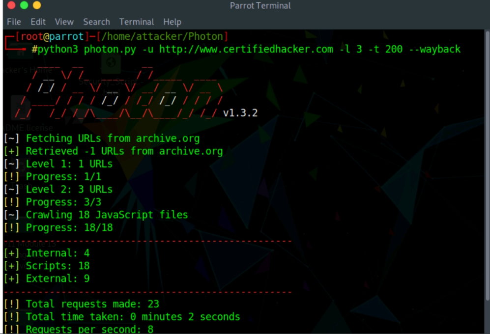 photon.py -u <URL of the Target Website> -l 3 -t 200 --wayback