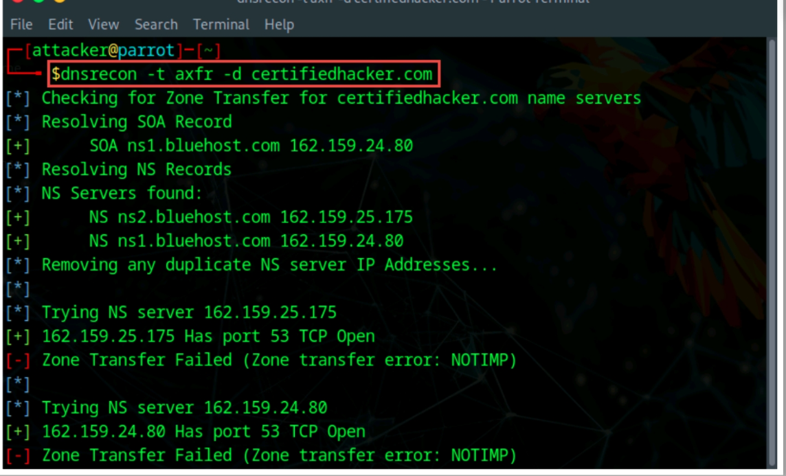 dig ns <dominio di destinazione>Il comando precedente recupera tutti i server dei nomi DNS del dominio di destinazione. Quindi, gli aggressori utilizzano uno dei server dei nomi dall’output del comando precedente per verificare se il DNS di destinazione consente i trasferimenti di zona. Utilizzano il seguente comando a questo scopo: