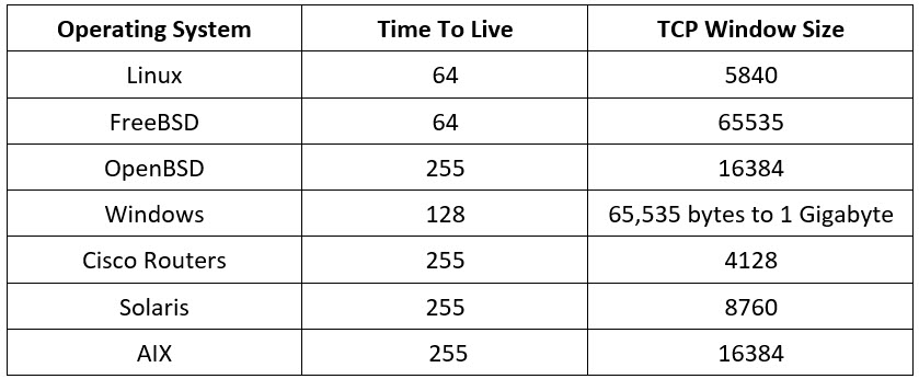 Il campo TTL determina il tempo massimo in cui un pacchetto può rimanere in una rete e la dimensione della finestra TCP determina la lunghezza del pacchetto riportato. Questi valori differiscono per diversi sistemi operativi: è possibile fare riferimento alla tabella seguente per apprendere i valori TTL e le dimensioni della finestra TCP associate a vari sistemi operativi.