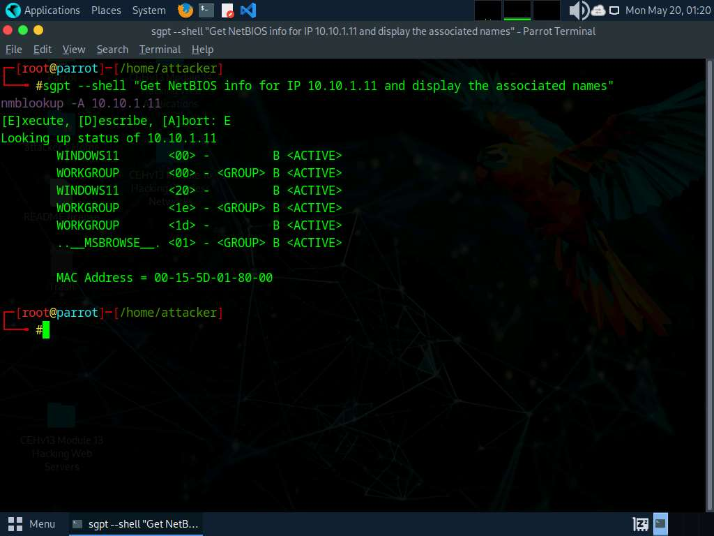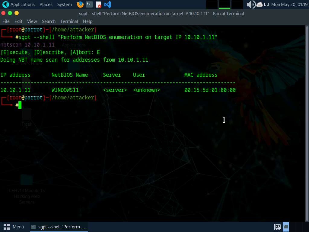 To create and execute a custom script to automate network enumeration tasks run sgpt —chat enum —shell “Develop and execute a script which will automate various network enumeration tasks on target IP range 10.10.1.0/24” command.