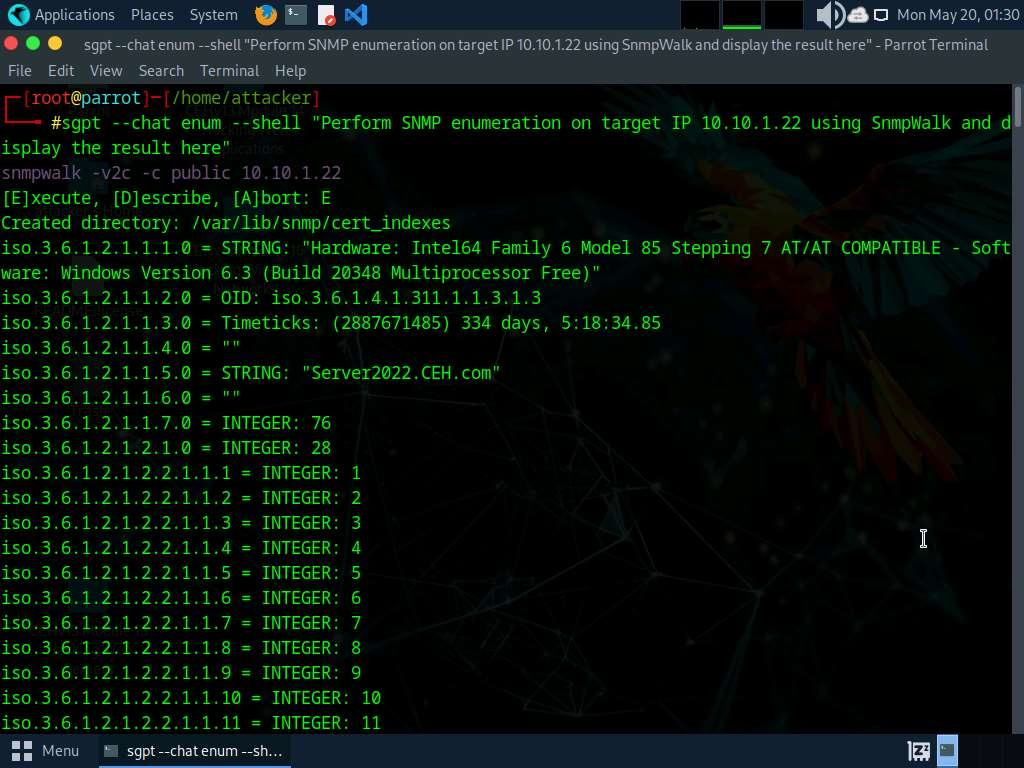 To perform FTP enumeration, run sgpt —shell “Use Nmap to perform FTP Enumeration on www.certifiedhacker.com” command.