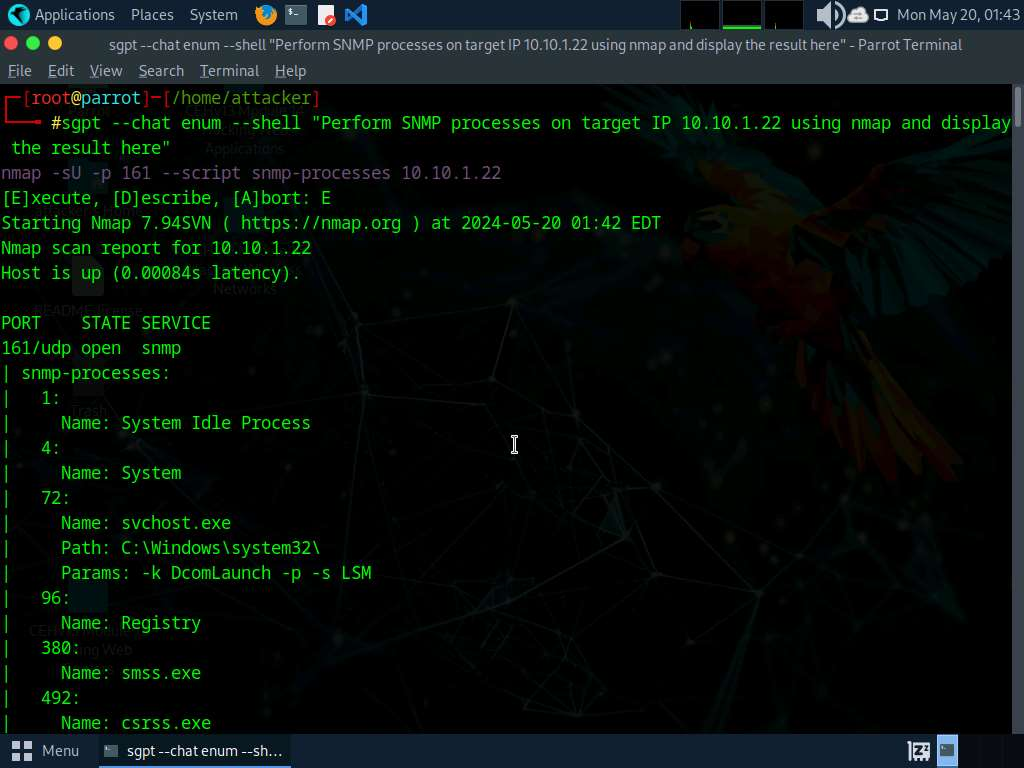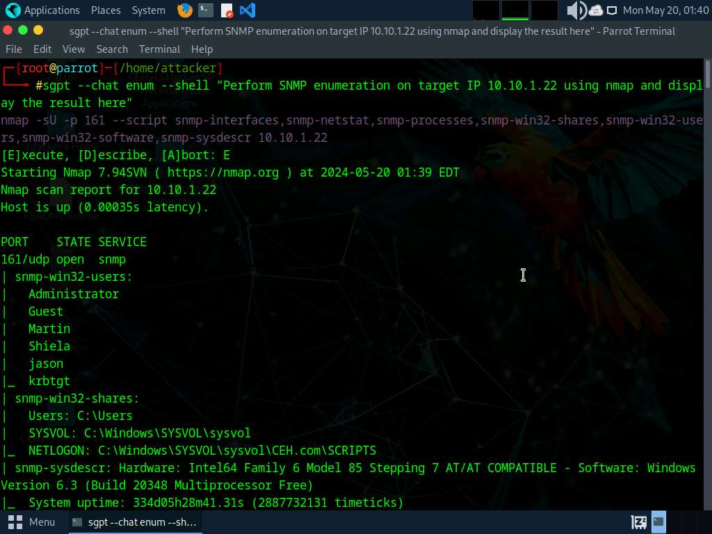We will perform LDAP enumeration using ShellGPT, to do so, run sgpt —shell “Use nmap script to perform ldap-brute-force on IP 10.10.1.22” command.