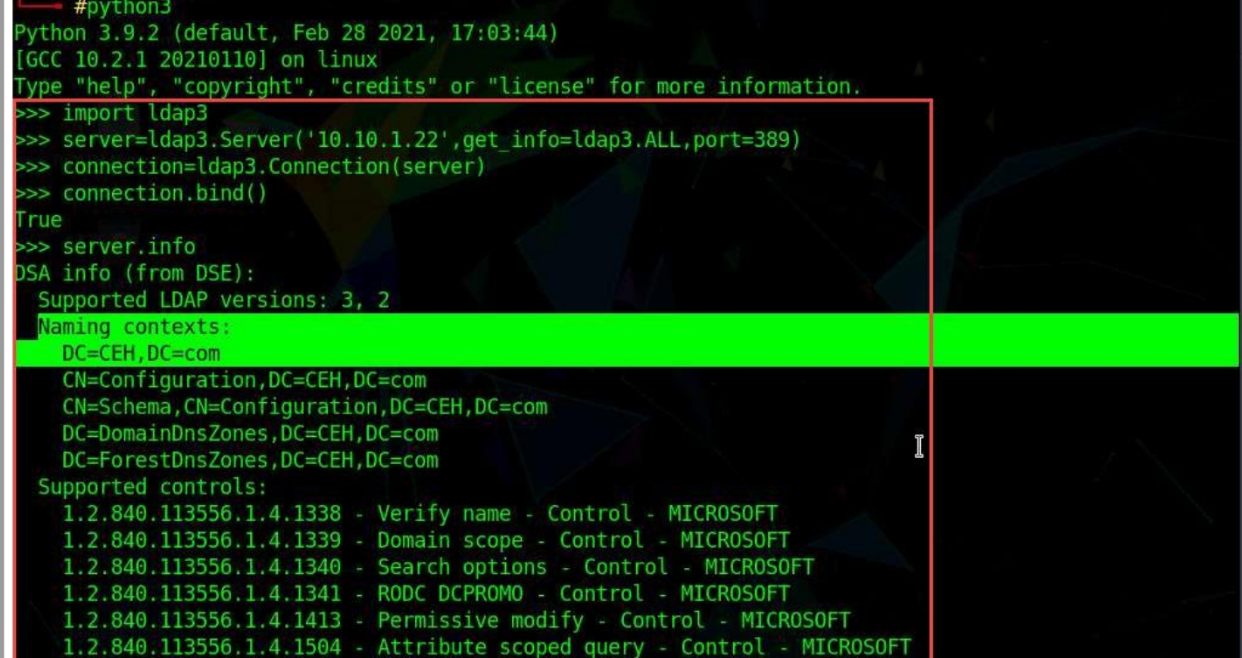LDAP (Lightweight Directory Access Protocol) è un protocollo Internet per l’accesso a servizi di directory distribuiti su una rete. LDAP utilizza DNS (Domain Name System) per ricerche rapide e risoluzione rapida delle query. Un client avvia una sessione LDAP connettendosi a un DSA (Directory System Agent), in genere sulla porta TCP 389, e invia una richiesta di operazione al DSA, che quindi risponde. BER (Basic Encoding Rules) viene utilizzato per trasmettere informazioni tra il client e il server. È possibile interrogare in modo anonimo il servizio LDAP per informazioni sensibili come nomi utente, indirizzi, dettagli dipartimentali e nomi server. Questo tipo di enumerazione va fatta una volta che si è all’interno della rete.