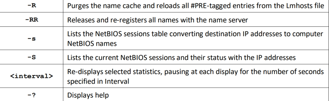 nbtstat [-a <remotename>] [-A <IPaddress>] [-c] [-n] [-r] [-R] [-RR] [-s] [-S] [<interval>][-?]