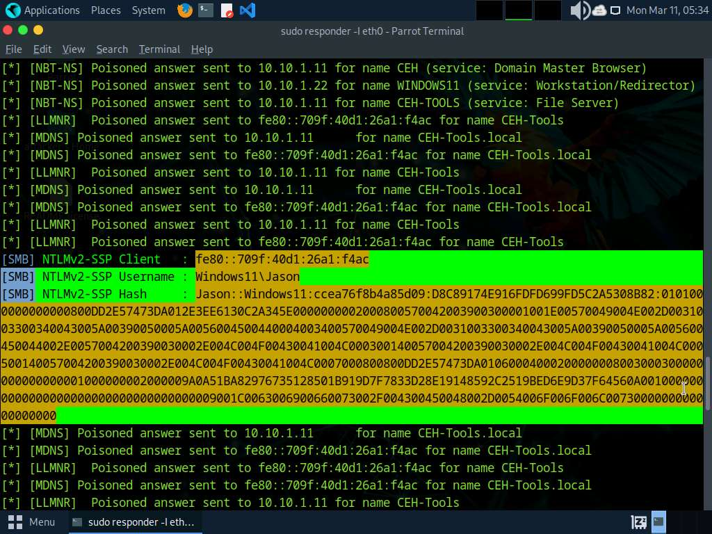 Lo strumento responder ci permette di ottenere con un po’ di fortuna gli hash degli utenti presenti in una rete interna con macchine Windows, per farlo possiamo lanciare il comando: