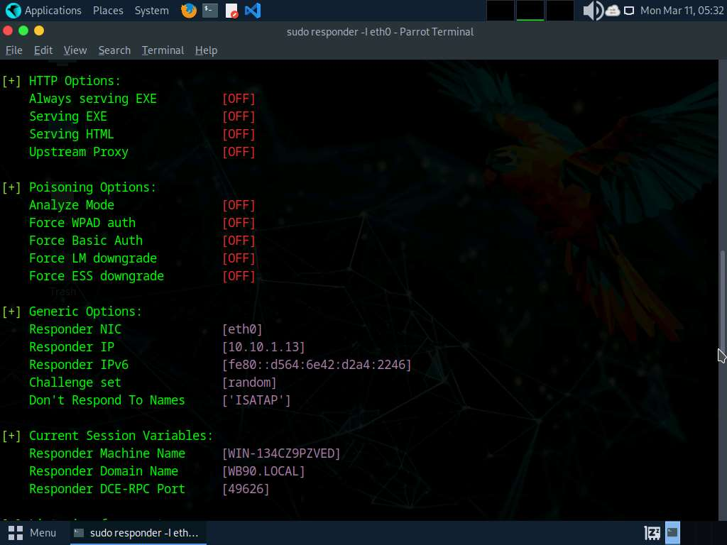 sudo responder -I <interfaccia di rete>Apparirà una pagina di ascolto: