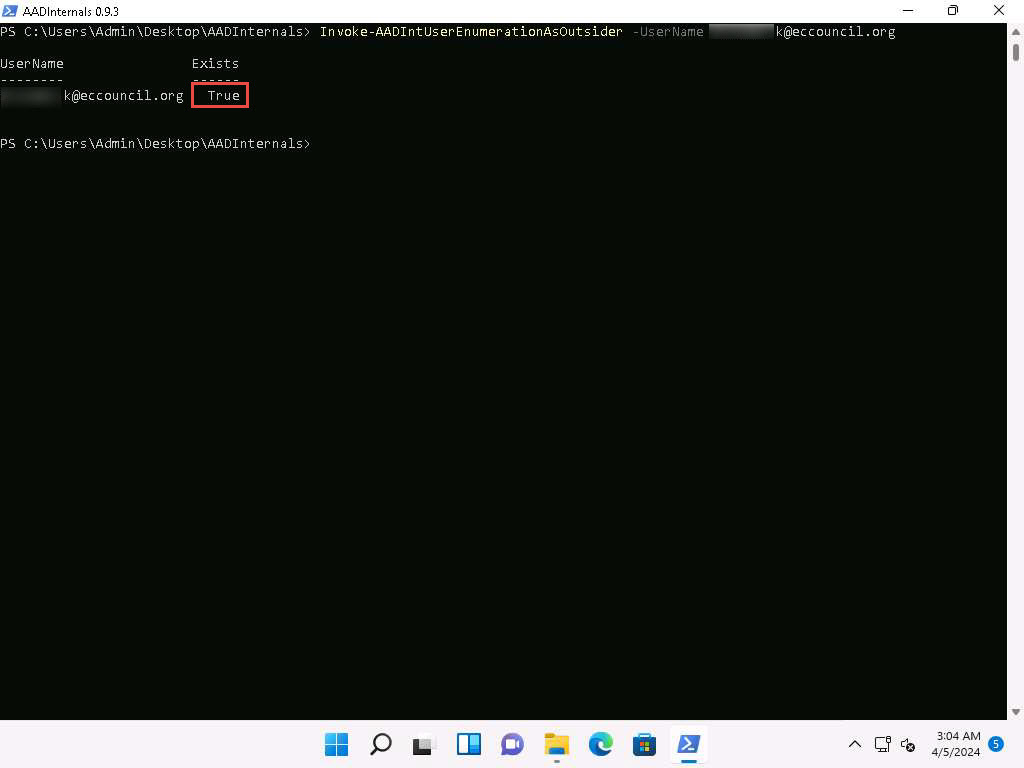 Invoke-AADIntUserEnumerationAsOutsider -UserName user@company.comSostituendo user@company.com con un probabile utente da verificare.
