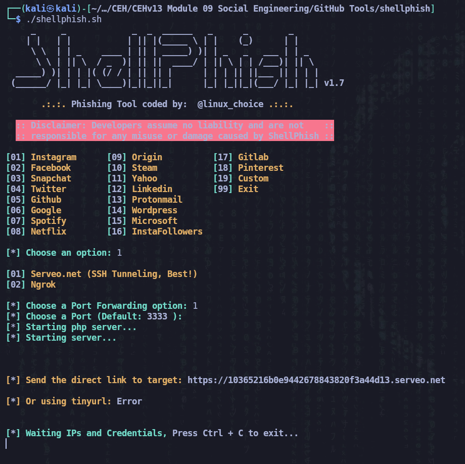 Questo strumento che non è più disponibile su github, ma che possiamo trovare nella cartella CEH ci permette di creare copie di siti famosi come Facebook, Instagram, Google, ecc nella sezione login in modo molto semplice, una volta creato il server che ospita il sito finto lo possiamo inviare alla vittima in modo tale che non appena la vittima inserisce le sue credenziali noi le cattureremo attraverso un keylogger già integrato nell’indirizzo malevolo.