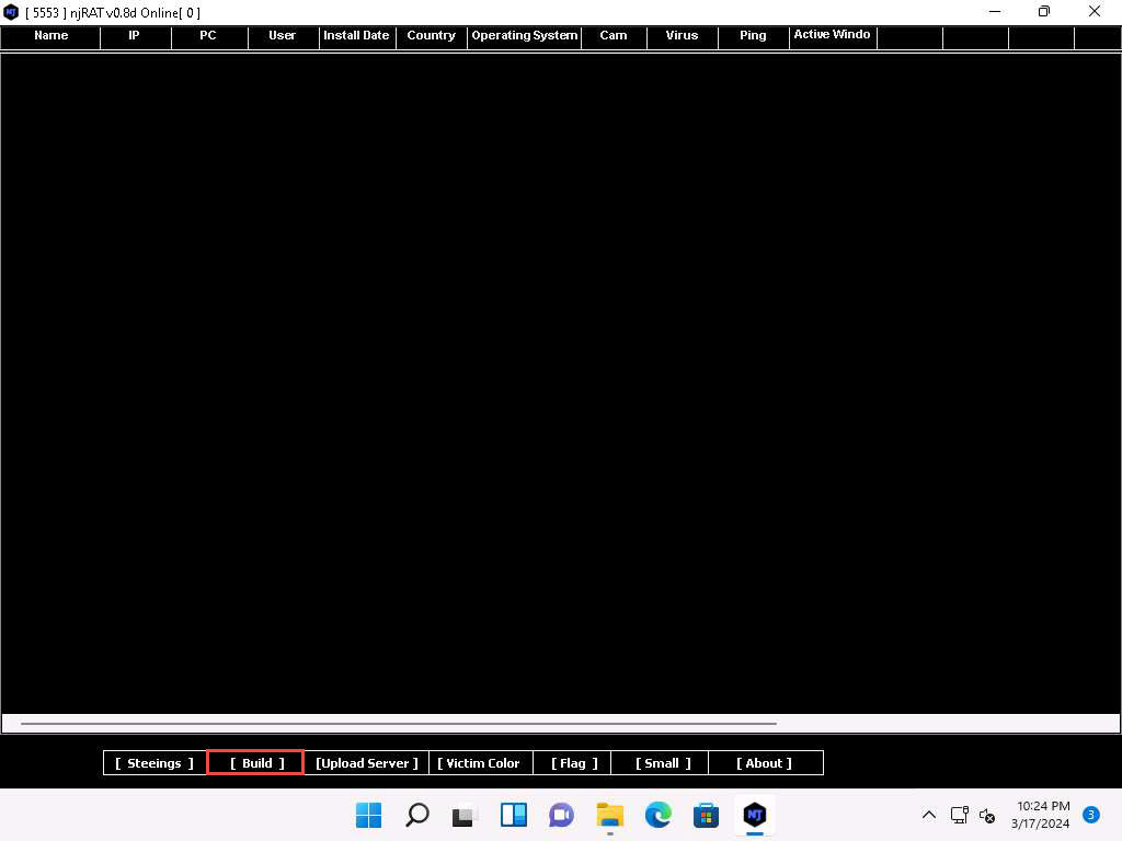 Per creare un trojan è sufficiente avviare il programma njRAT (RAT sta per Remote Access Trojans) una volta avviato cliccare su Build: