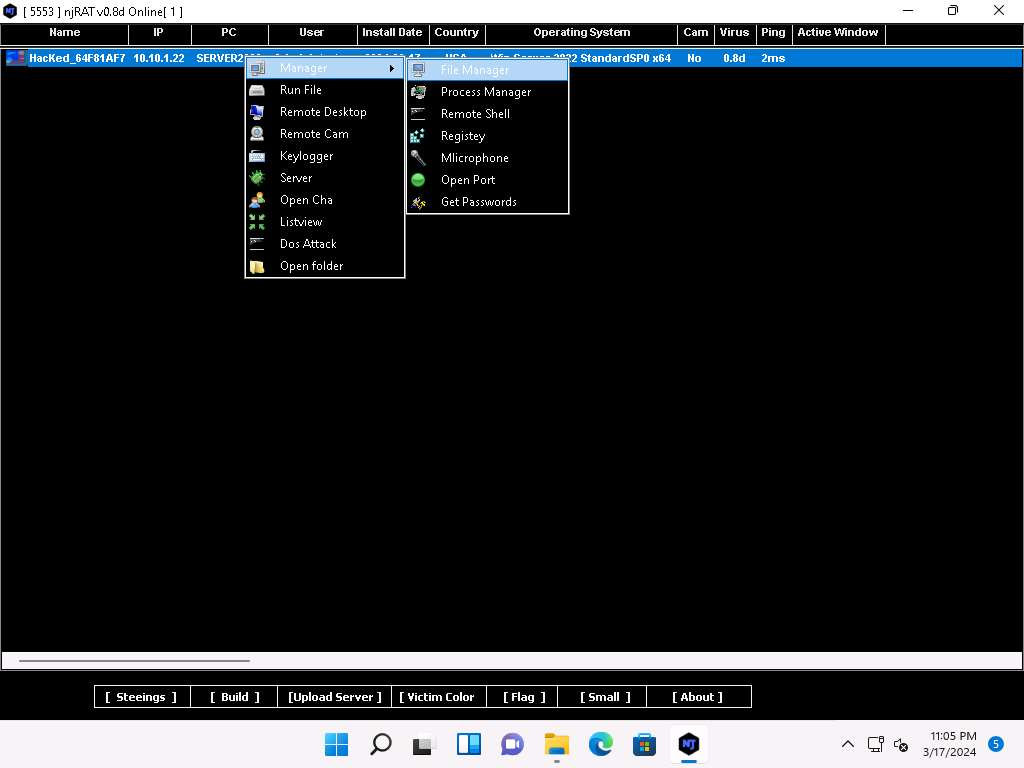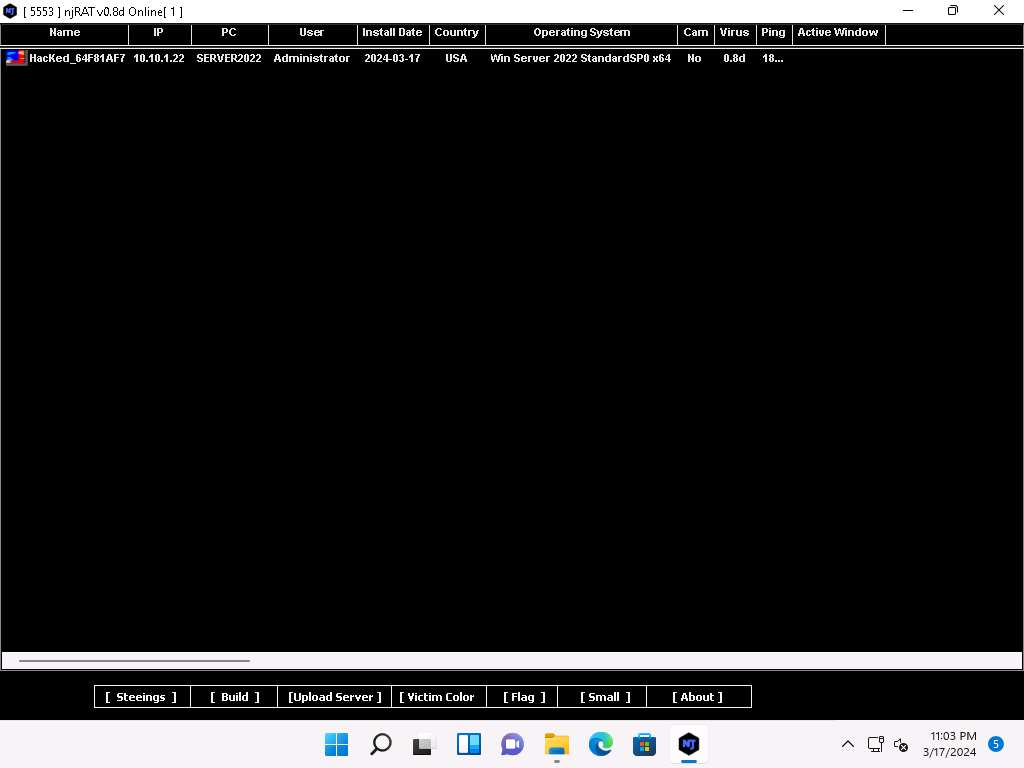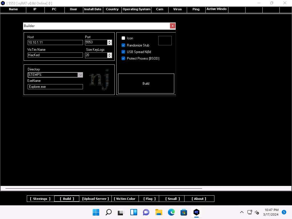 Una volta che si apre il popup inseriamo l’indirizzo IP dell’attaccante e clicchiamo le flag Randomize Stub, USB Spread Nj8d, Protect Prosess [BSOD]. L’indirizzo IP da inserire è quello dell’attaccante.