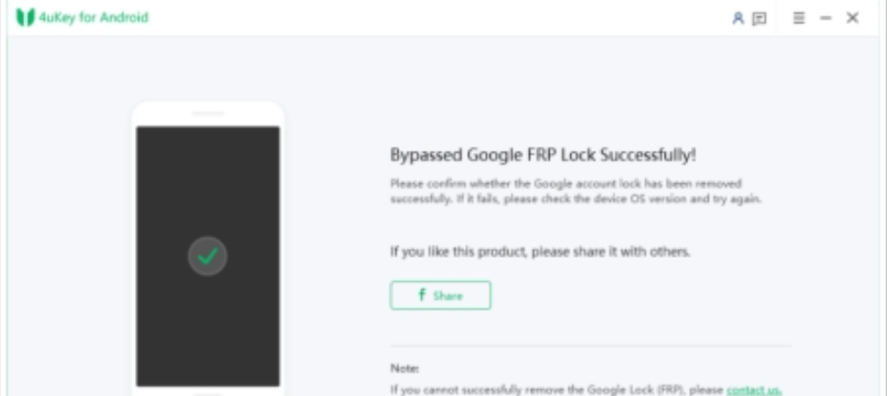 Passaggio 5: al completamento con successo, riceverai una finestra di notifica che visualizza il messaggio “Bypassed Google FRP Lock correttamente”