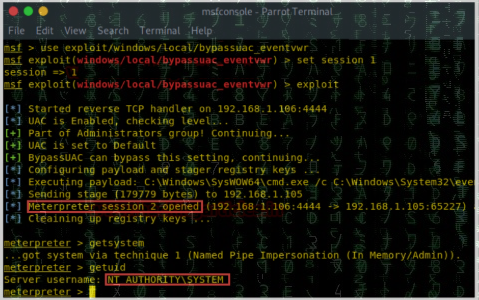 Puoi utilizzare l’exploit use exploit/windows/local/bypassuac_fodhelper, si presuppone che tu abbia già accesso alla macchina quindi avendo una sessione in background puoi caricare questo payload tramite il comando set session 1: