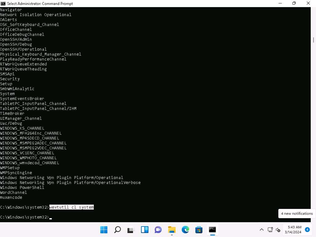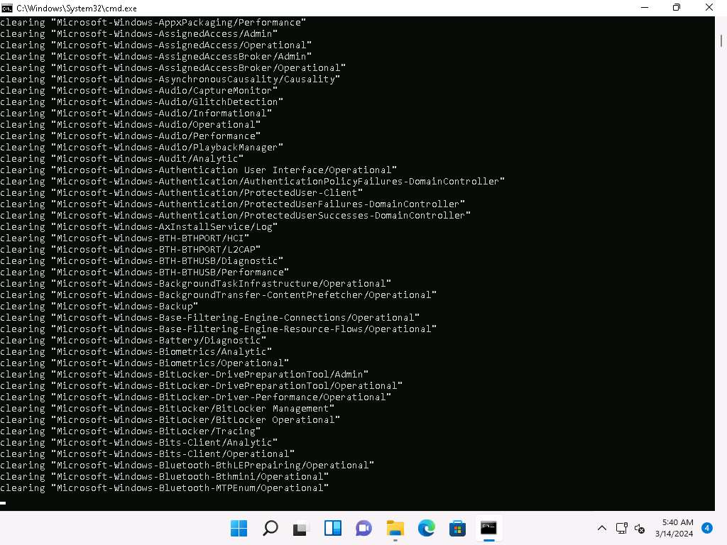 wevtutil cl SystemQuesto comando cicla tutti i registri e li cancella uno per uno: