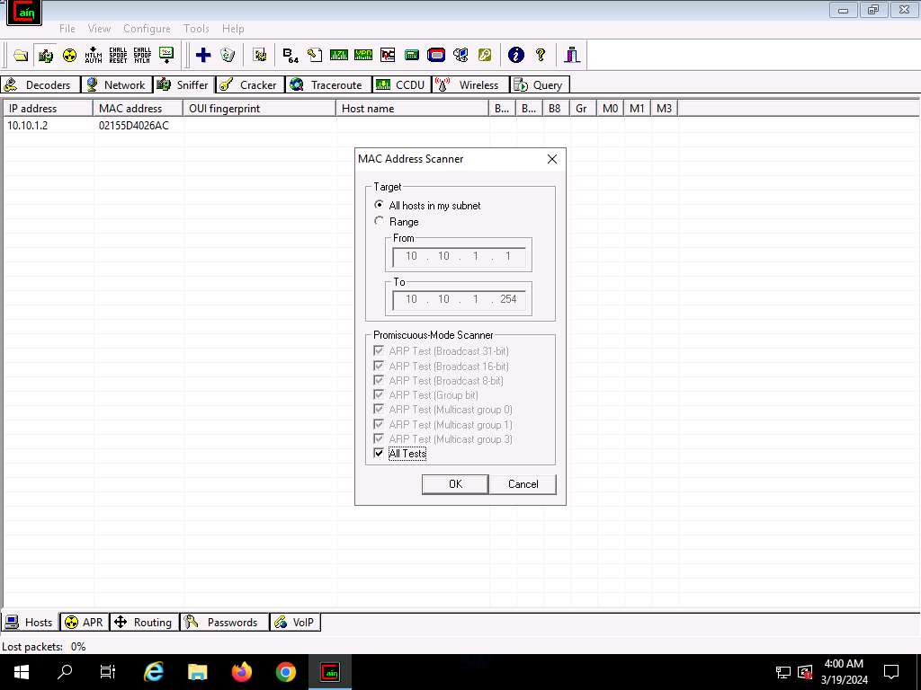 Ora clicca la casella sniffing e o con il tasto blu + o cliccando col destro nella parte vuota della pagina e poi Scan Mac Address apparirà un popup nel quale andremo a selezionare All Host in my subnet e All tests:
