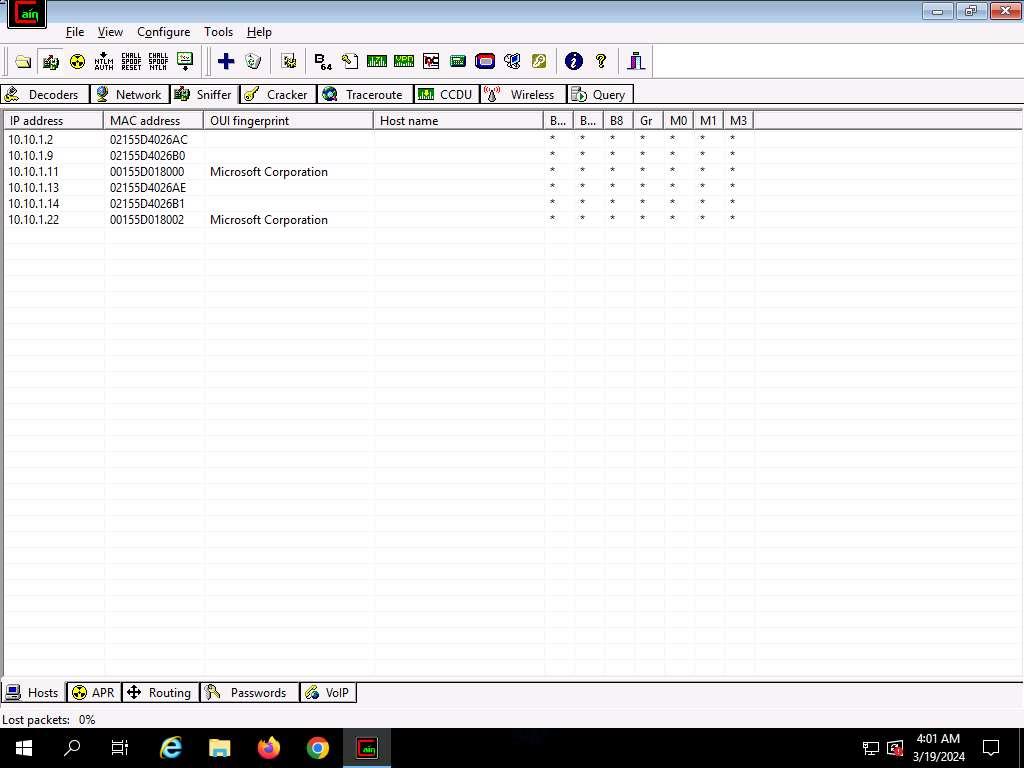 Cain & Abel inizia la scansione degli indirizzi MAC ed elenca tutti quelli trovati. Dopo il completamento della scansione, viene visualizzato un elenco di tutti gli indirizzi IP attivi insieme ai corrispondenti indirizzi MAC: