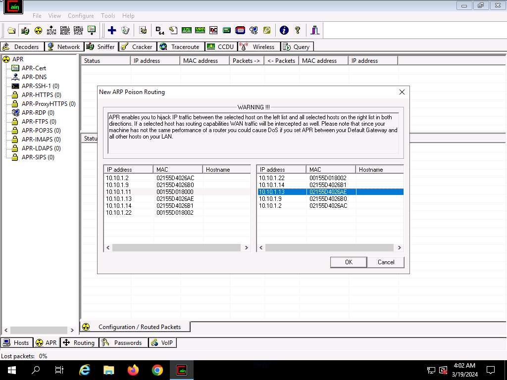 Ora che abbiamo gli indirizzi IP possiamo iniziare l’operazione di poisoning, clicchiamo l’icona APR in basso a sinistra, una volta aperta la nuova pagina clicchiamo ovunque nella tabella vuota e il pulsante del + dovrebbe divenire cliccabile e colorato di blu, cliccliamo il pulsante + e ci dovrebbe apparire una pagina popup con gli indirizzi IP trovati in precedenza sulla sinistra, ora sostanzialmente noi andremo a cliccare su un indirizzo IP e ci appariranno gli altri indirizzi IP sulla destra, questo succede perchè noi ci andremo a mettere in ascolto fra i due indirizzi IP selezionati (praticamente un MITM), quindi scegli attentamente gli indirizzi da selezionare (Con il tasto Shift è possibile selezionare più indirizzi IP permettendoci di monitorare il traffico tra più utenti):