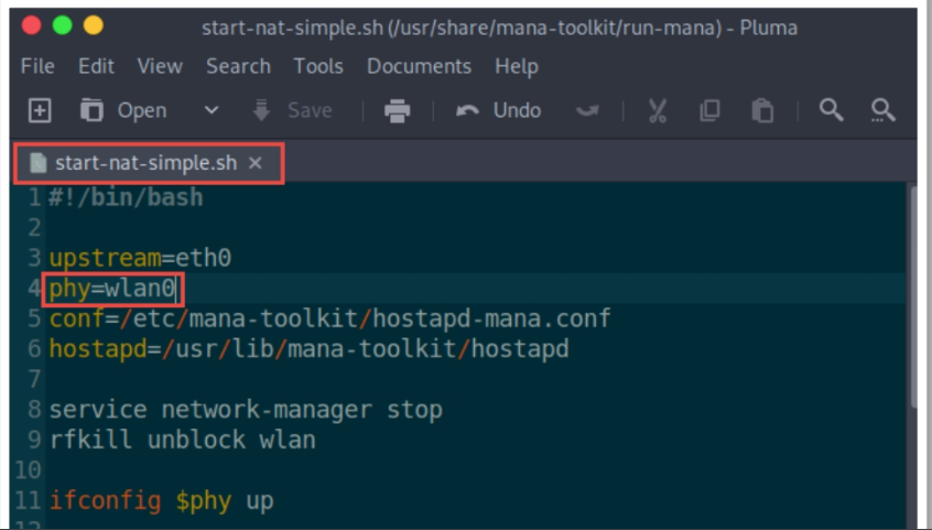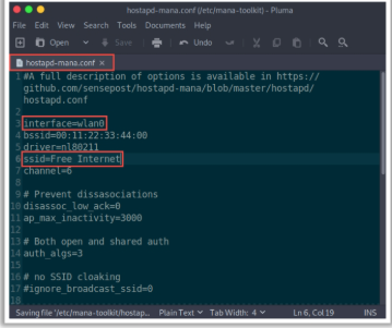 Scarica la suite di programmi e modifica il file hostapd-mana.conf sostituendo interface, BSSID e SSID come nella seguente immagine: