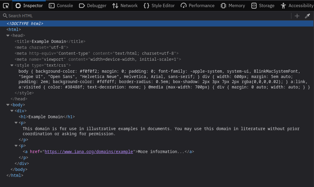 Prima di immergerci in XSS basato su DOM, esaminiamo cos’è il Document Object Model (DOM). Il DOM è un’interfaccia di programmazione che rappresenta un documento Web come un albero. Il DOM consente di accedere e manipolare a livello di programmazione le diverse parti di un sito Web utilizzando JavaScript. Consideriamo un esempio pratico. Consideriamo il codice HTML di example.com nello screenshot qui sotto (come recuperato il primo febbraio 2024). Abbiamo aperto Web Developer Tools utilizzando il browser Web Firefox e controllato la scheda Inspector.
