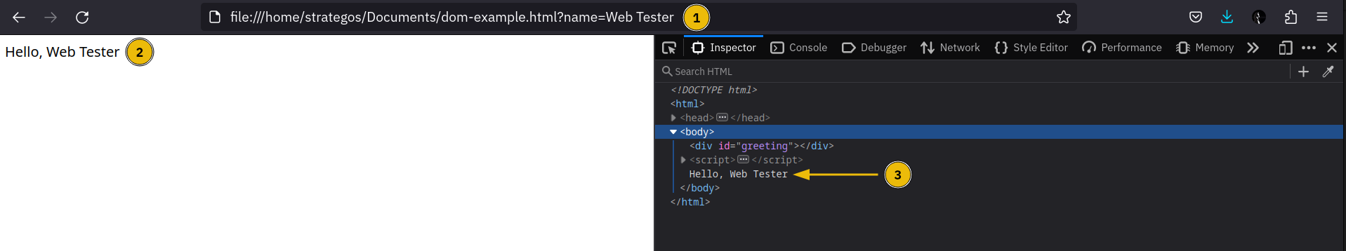 L’albero inizia con il nodo del documento e si ramifica in DOCTYPE e html. Il nodo html si ramifica in head e body. La head ha il titolo, alcuni meta tag e uno stile. In questo semplice esempio, il body ha un singolo div che si ramifica in un h1 e due p. Questa è una pagina concisa. Pagine più reali avrebbero decine o centinaia di rami. Possiamo visualizzare l’albero DOM utilizzando gli Strumenti per sviluppatori Web integrati nel browser Web.