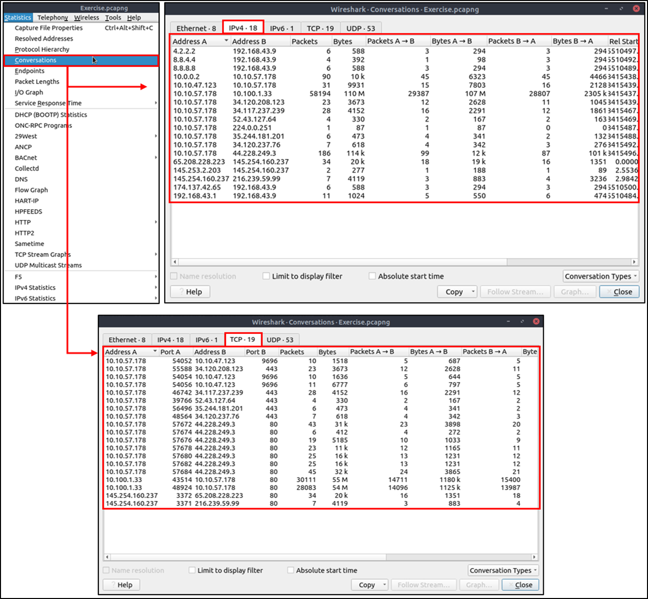 La conversazione rappresenta il traffico tra due endpoint specifici. Questa opzione fornisce l’elenco delle conversazioni in cinque formati di base: Ethernet, IPv4, IPv6, TCP e UDP. In questo modo, gli analisti possono identificare tutte le conversazioni e contattare gli endpoint per l’evento di interesse. È possibile utilizzare il menu “Statistic ⇒ Conversations” per visualizzare queste informazioni: