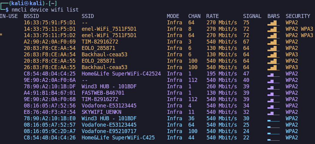 Per prima cosa possiamo lanciare questo comando per vedere tutte le reti WiFi intorno a noi: